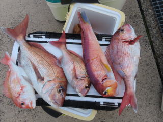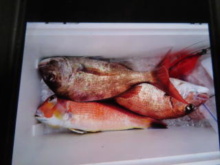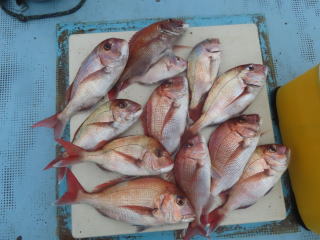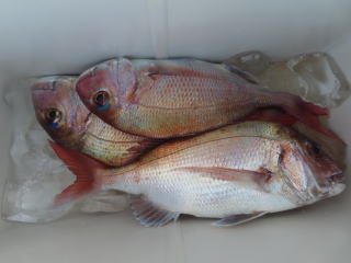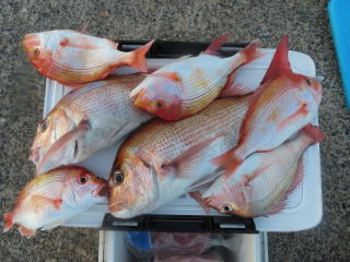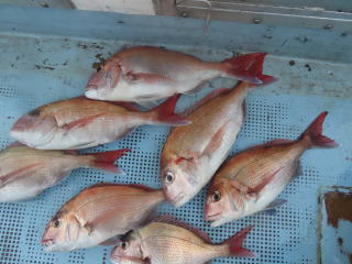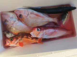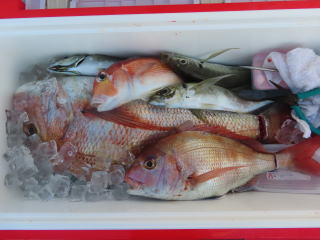 | 午前船 マダイ(延長) 0.8キロ〜6.5キロ 船中 21枚 他アジ ハナダイ レンコダイ カツオ メバル ウッカリカサゴ 大型アマダイ サバ |