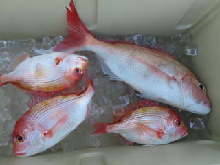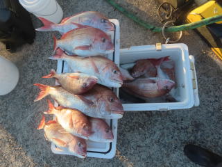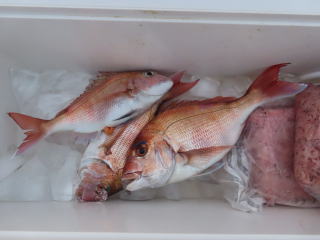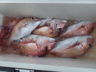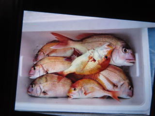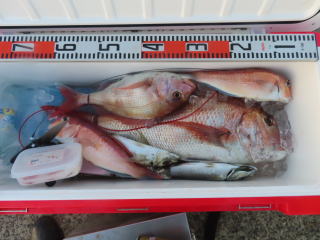 | 午前船 マダイ(延長) 0.8キロ〜6.5キロ 船中 21枚 他アジ ハナダイ レンコダイ カツオ メバル ウッカリカサゴ 大型アマダイ サバ |